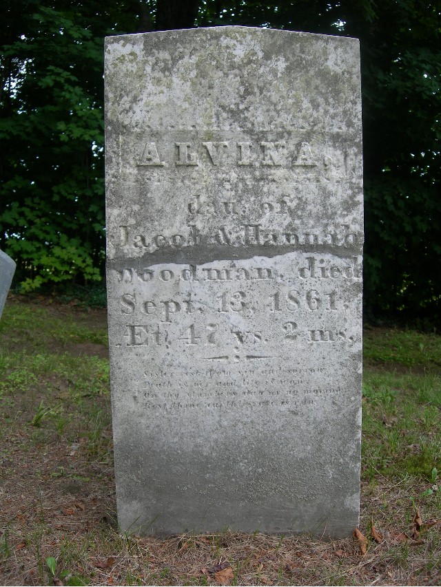 Alvina Woodman was born on 21 June 1814 at Auburn, Maine. She was the daughter of Jacob Woodman and Hannah Hatch. Alvina Woodmanappeared on the US Census of 1850 in the household of Jacob Woodman and Hannah Hatch at Auburn, Maine.1 Alvina Woodmanappeared on the US Census of 1860 in the household of Jacob Woodman at Auburn, Maine.2 Alvina Woodman died on 13 September 1861 at Auburn, Maine, at age 47. She was buried at Davis Cemetery, East Auburn, Maine.