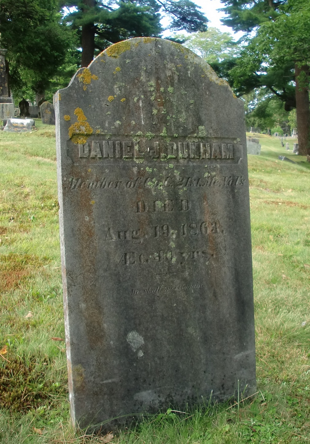Daniel, age 36 years, and Rhoda, age 44 years, appeared on the US Census of 1860 at Bath, Maine.2 Daniel J. Dunham died on 19 August 1863 at McDougal General Hospital, Fort Schuyler, Bronx, New York City, New York, at age 40 from an infected knee which had been wouned in the battle of Port Hudson. He was buried on 25 August 1863 at Maple Grove Cemetery, Bath, Maine. Daniel's epitaph reads: