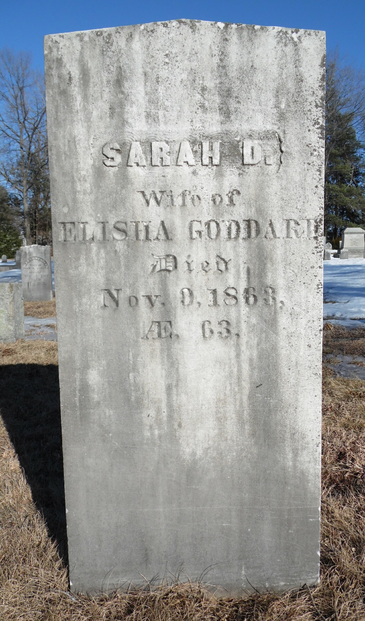 Sarah Desire Ward, age 22, married Elisha Goddard, age 23 , son of John Goddard and Delia Kady, on 7 January 1823 at Orange, Massachusetts. Sarah Desire Ward died on 11 September 1863 at Orange, Massachusetts, at age 62. She was buried at Central Cemetery, Orange, Massachusetts. Sarah's epitaph reads: