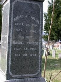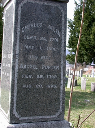 Rachel Porter married Charles Allen, son of Isaac Allen and Lenner Polhemus, in 1822.1 Rachel, age 56 years, and Charles, age 58 years, appeared on the US Census of 1850 at Armstrong Township, Lycoming County, Pennsylvania.2 Rachel Porter was buried at Williamsport Cemetery, Williamsport, Lycoming County, Pennsylvania. Rachel's epitaph reads: