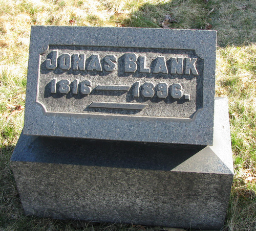 According to Boucher (1906): "Having been reared on a farm he naturally chose that occupation for his life work, and continued the same until his retirement from active business, thereby gaining a comfortable livelihood, and a goodly competence for his declining vears. He held all the local offices in the Lutheran church, in which body he held membership for many years. He, like his father, was a Democrat in politics.2" Jonas Blank died on 24 February 1896 at Greensburg, Westmoreland County, Pennsylvania, at age 79.1 He was buried at Union Cemetery, Greensburg, Westmoreland County, Pennsylvania.