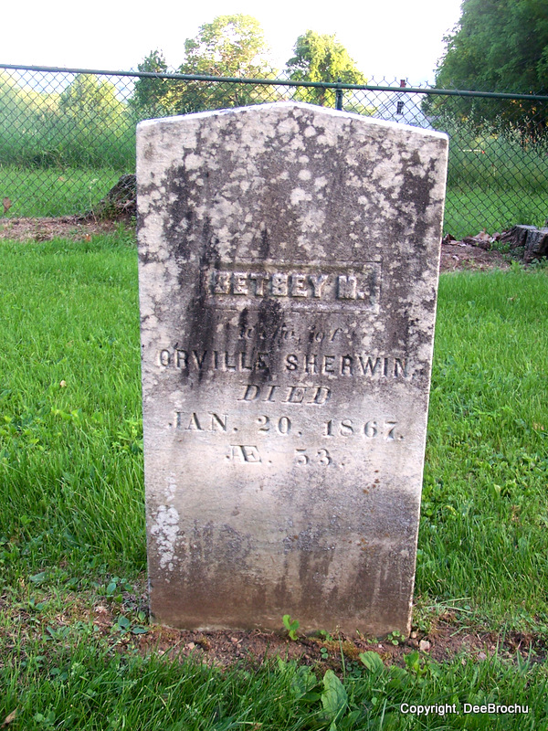 Betsey M. Ware married Orville Sherwin, age 27 , son of William Sherwin and Marcia Carter, on 26 December 1843 at Buckland, Massachusetts.6,5,1,2,7 Betsey, age 36 years, and Orville, age 33 years, appeared on the US Census of 1850 at Buckland, Massachusetts.8 Betsey, age 41 years, and Orville, age 38 years , appeared on the Massachusetts State Census of 1855 at Buckland, Massachusetts.3 Betsey, age 46 years, and Orville, age 43 years, appeared on the US Census of 1860 at Sugar Grove, Kane County, Illinois.9 Betsey, age 51 years, and Orville, age 48 years , appeared on the Massachusetts State Census of 1865 at Shelburne, Massachusetts.10 Betsey M. Ware died on 20 January 1867 at Shelburne Falls, Massachusetts.6,1,2,7,4 She was buried at Arms Cemetery, Shelburne, Massachusetts, in section R2. Betsey's epitaph reads: