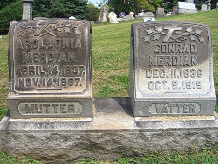 Mrs. Applonia Merdian, wife of Conrad Merdian, is dead at her late home in Butler street, Etna. She was 71 years old and was born in Germany. She is survived by her husband, four sons and two daughters. There are 40 grand-children.10 She was buried on 17 November 1907 at Saint Mary's Cemetery, Sharpsburg, Allegheny County, Pennsylvania, in the old section.1,3