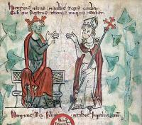 Henry II Curt Mantel King of England, age 21, married Eleanor of Aquitaine, daughter of William X , Duke of Aquitaine and Éléonore de Châtellerault, on 18 May 1153.1,2,3,5,7,8,9 Henry was crowned on 25 October 1154 at Westminster Abbey, Westminster, London, England.2 He and Ida Plantagenet were in a relationship that produced offspring circa 1170. A dispute between the King and the Archbishop of Canterbury, Thomas Becket, lead to Thomas' murder in the cathedral in December 1170. A year later, Henry invaded Ireland. Henry II Curt Mantel King of England died on 6 July 1189 at Château Chinon, Normandy, France, at age 57.1,2,4,5,6,7 He was buried at Fontevrault Abbey, Fontevrault, Anjou, France.1,5