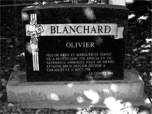 Captain Oliver Blanchard married Catherine-Joséphe Amirault dite Mirau, daughter of Pierre Amireau and Anne Brun, circa 1752.1 Oliver was a carpenter.1 The government of Nova Scotia, on 29 March 1784, granted 14,150 acres in one block to thirty-four French families. He was one of them, making him one of the founders of Caraquet.3 He died on 16 August 1796 at Caraquet, New Brunswick, Canada.1,2 He was buried at Cimetière du Bocage, Caraquet, New Brunswick, Canada.2