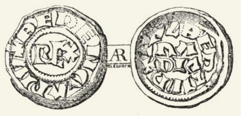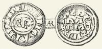 A silver denarius issued by Berengar (who is named on the obverse) and Adalbert (who is named on the reverse). The reverse reads Papia for Pavia.